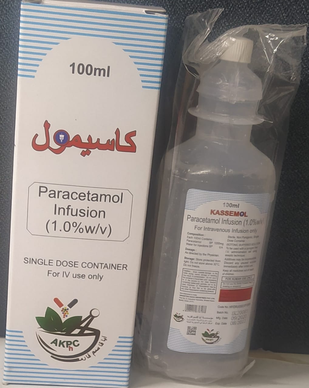 "Each 100ml Contains: Paracetamol BP 1000mg Water for injections BP q.s." |