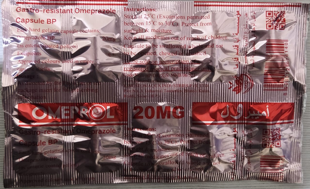 "Each hard gelatin capsule contains Omeprazole BP 20mg (as enteric coated pellets) Excipients q.s. Approve colours used in empty capsule shells." |