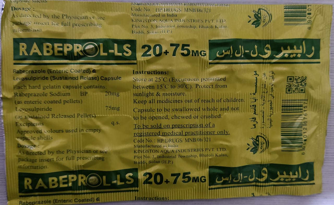 "Each hard gelatin capsule contains: Rabeprazole Sodium BP 20mg (as enteric coated pellets) Levosulpiride 75mg (as sustained Released Pellets) Excipients q.s. Approved colours used in empty capsule shells" |